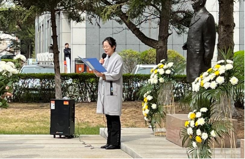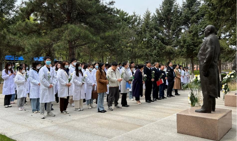 同学们向兽医先贤敬花