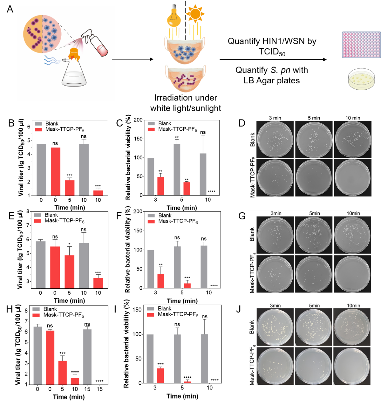 新型冠状病毒SARS-CoV-22019年底被发现以来,在全球迅速传播和流行,给人类健康和社会公共卫生安全带来了巨大威胁。口罩作为日常防护装备被广泛使用,但病原体可以在口罩表面存活和积累,长时间或重复使用一次性口罩会增加佩戴者的感染风险,并且使用口罩的不恰当处置也可能造成传染性病原体的再次传播。因此,本研究制备了自清洁可穿戴口罩,通过负载AIE的高效I型和II型光敏剂,实现呼吸道感染性病原体的灭活。该口罩在低功率白光或太阳光模拟器照射下产生大量ROS对吸附到表面的甲型流感病毒H1N1和肺炎链球菌进行高效灭活,从而为日常口罩自清洁提供了基础。该研究基于高效聚集诱导发光光敏剂来灭活口罩上残留的病原体,可以减少口罩在丢弃后造成的环境污染及预防病原体的再次传播,该自清洁策略也为其他空气传播病原体的防控提供了策略。