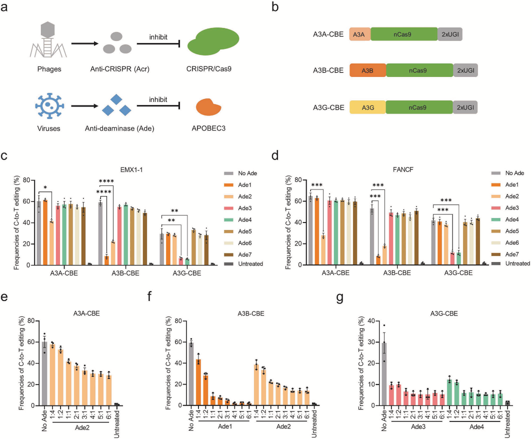 本研究基于针对四种病毒衍生的抗脱氨酶(Ades)的研究,证明其通过抑制APOBEC3催化域、将脱氨酶重新定位到核外区域或降解整个CBE复合物来拮抗CBE。通过设计脱氨酶结构域,其他常用的碱基编辑器,如CGBEA&CBEA&CGBErA1-CBEABE8e,可以被Ades适度抑制,扩大其应用范围。其次,研究发现基于微小RNA应答Ade载体的细胞类型,可特异性调控CBE-ON开关,表现其具有广泛的实用性。这些天然脱氨酶特异性ade是可以用来调节BEs基因组工程功能的工具。