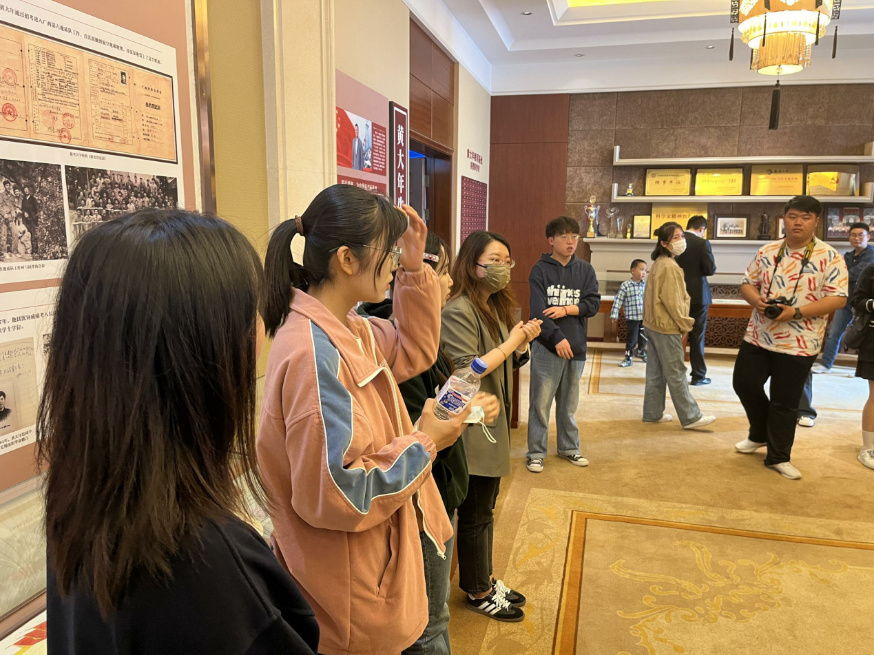 在讲解老师带领下,同学们参观了黄大年先生生前工作的办公室,对黄大年老师的一生以及先生生前用过的物品等内容进行了讲解。他在入党志愿书中写到的那句“若能做一朵小小的浪花奔腾,呼啸着加入献身者的滚滚洪流中,推动历史向前发展,才是一生中最值得骄傲和自豪的事情”,至今仍广为传颂,影响深远。一封封手稿,一张张图片,一件件史料,一部部影像,让黄大年同志生前的剪影栩栩如生。一一再现了黄大年从少年立志筑梦,青年求学追梦,学成归国圆梦各个时期的经历和事迹。让大家深切感受到黄大年同志的爱国情怀,教书育人、敢为人先的敬业精神,淡泊名利、甘于奉献的高尚情操。他用自己的一生,书写了“振兴中华,乃我辈之责”的九字箴言!