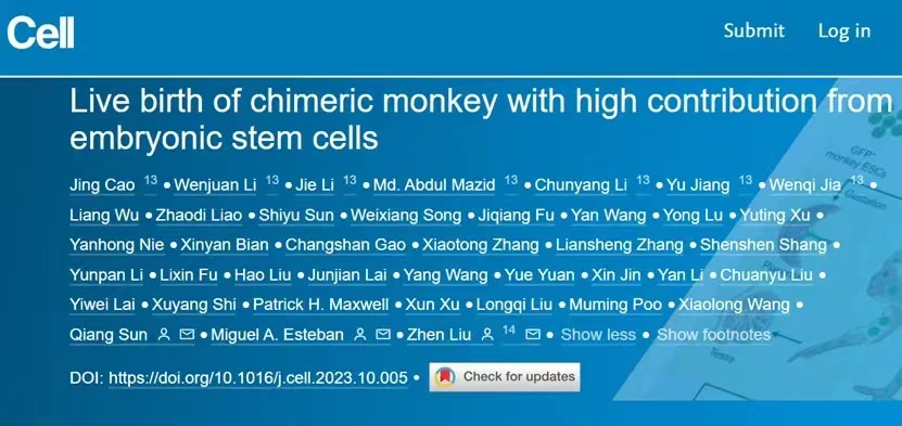 Miguel A. Esteban研究组、中国科学院脑科学与智能技术卓越创新中心(神经科学研究所)非人灵长类研究平台孙强研究团队合作在Cell期刊发表了封面文章Live birth of chimeric monkey with high contribution from embryonic stem cells。该研究首次成功构建了高比例胚胎干细胞来源的出生存活嵌合体猴,并证明了猴胚胎干细胞可以高效的贡献到胚外胎盘组织和生殖细胞。这对于理解灵长类胚胎干细胞全能性和非人灵长类模型构建具有重要意义。