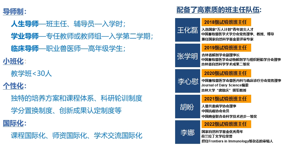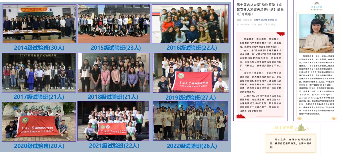 2014年试办卓越人才培养试验班,实行“一制三化”:导师制、小班化、个性化、国际化,现组建10期,累计237名学生,目前读研率为98%,出国交流率41%,科研参与率100%,发表SCI论文影响因子总数154.95,获国家级竞赛奖项59项。以2024届动物医学(卓越农林人才拔尖培养计划)试验班为例,班级27名学生,英语四六级通过率为100%,85%的同学被推免到清华、北大、中科院等双一流A类大学或科研院所,2人入选DVM项目,班级被评为“2023年成人短视频