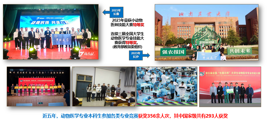 积极推动建立“讲授-实验-科研-临床-综合”五位一体的人才培养机制和模式。统筹课程实验、综合实验、临床实践与一线医疗教学病例为一体。采取“三段三轨随机介入”模式,即按理论、实验、再临床教学,根据教学内容需要,也可随机交叉、并行或颠倒顺序,一旦有临床教学病例,随时介入。学院学生国家执业兽医资格考试通过率为全国平均水平的两倍;学生可以用英语进行交流、动物临床资料记录及撰写研究文章,每年均有一定数量的本科生到境外学习培训或攻读学位,具备一定国际视野;本科生参加全国大学生动物医学专业技能大赛连续4届获得特等奖。研究成果获成人短视频
