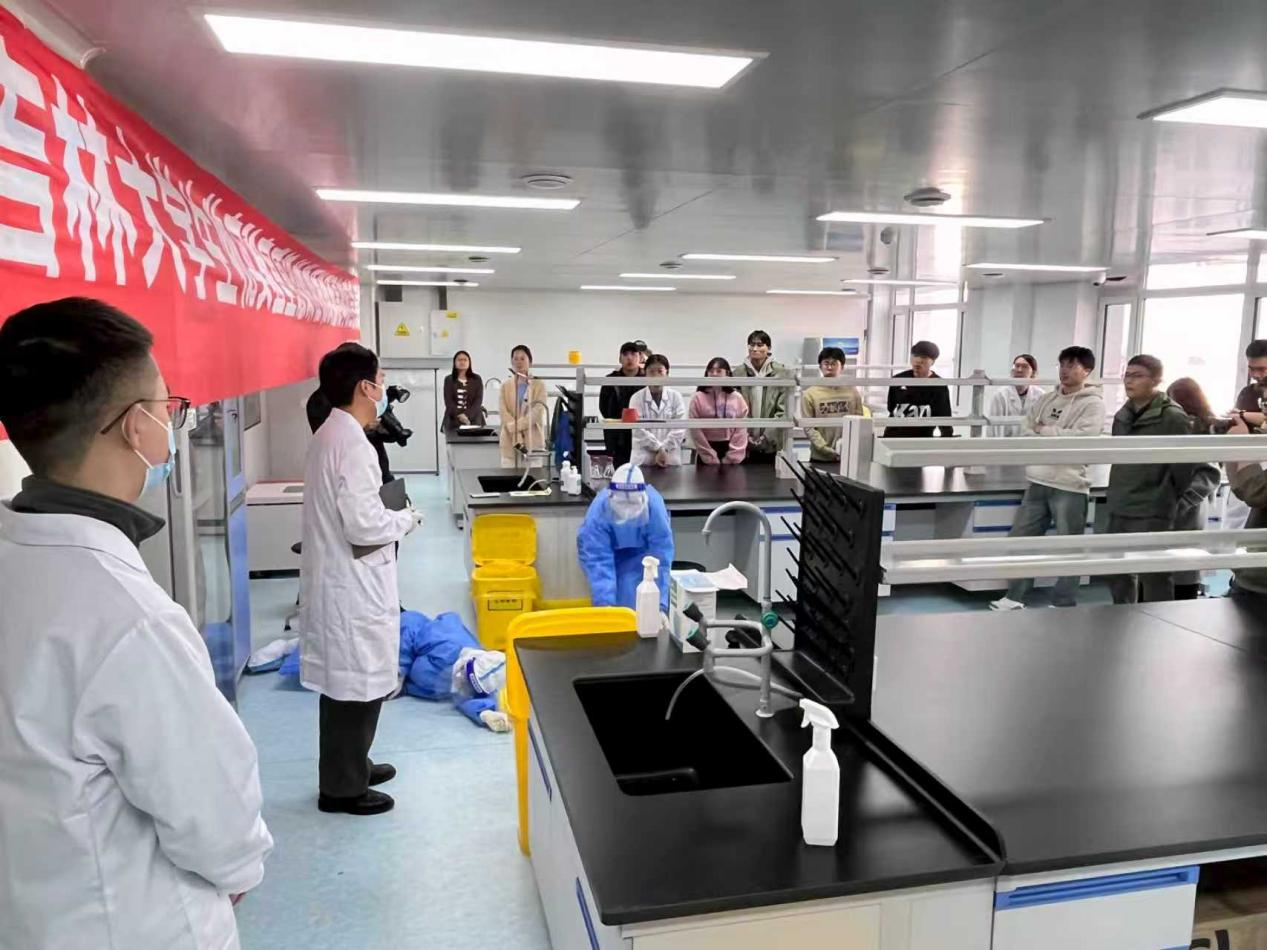 本次演练采用了“模拟情景+实操演练”的方式。企业人员与事先培训好的8名研究生,先后进行了致病性病原体意外泄漏场景模拟以及事故发生后的应急疏散、现场临时隔离、事故报告、应急处置、应急救助、现场恢复流程进行实操演练。整个应急处置流程响应快速,科学规范,参加演练的同学沉浸式体验了整个操作流程,旁观学习的同学通过认真观察,也详细了解和学习了整个操作流程。